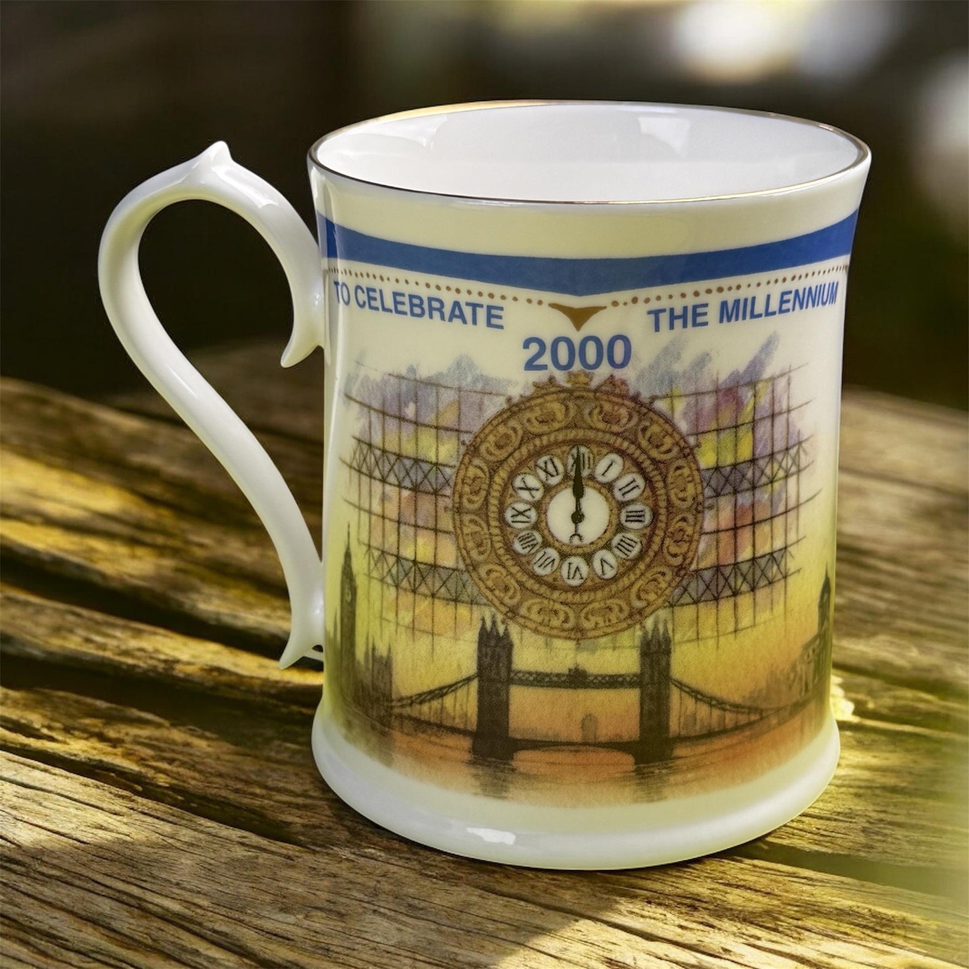 Aynsley Millennium 2000 Fine Bone China Mug, produced as a limited edition of 5,000 pieces exclusively for Peter Jones China of Wakefield. Made in England, this commemorative mug celebrates the turn of the millennium with a detailed London skyline featuring Big Ben and Tower Bridge, complemented by Union Jack detailing.