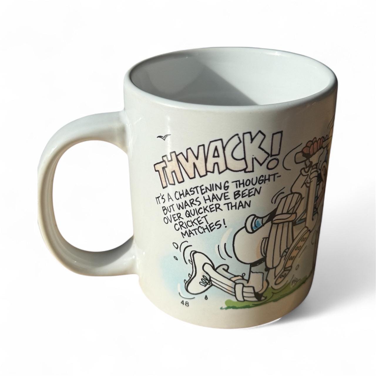 There’s something timeless about a good cup of tea and a game of cricket, and this 1994 “Cricket Fanatic” ceramic mug captures that classic British humour perfectly. Produced by Xpressions, this vintage mug features bold cartoon-style artwork and playful lettering typical of 1990s sports humour.