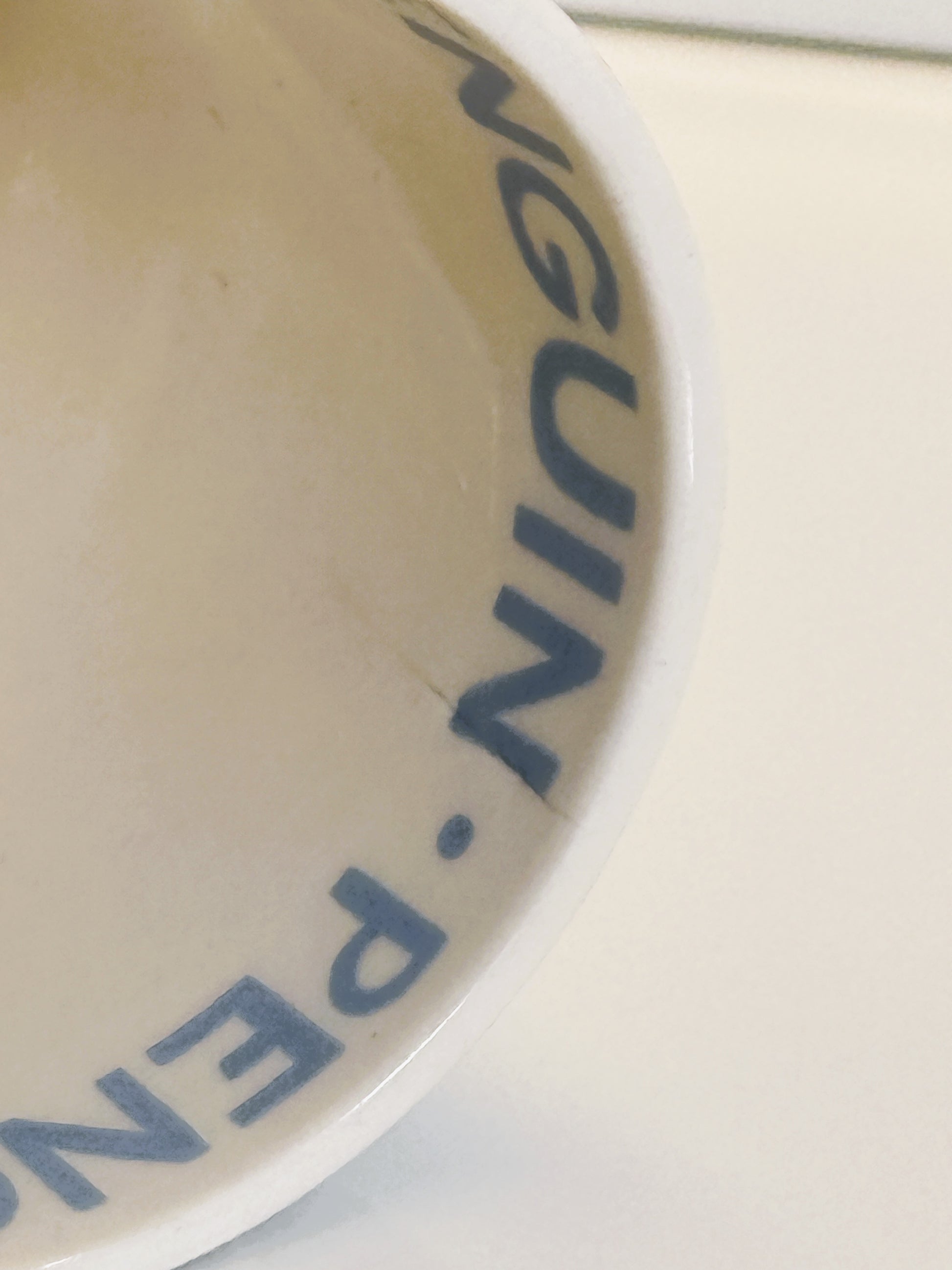 This Emma Bridgewater Penguin in a Snowstorm mug is a charming example of British pottery, featuring a repeating penguin motif set against a soft blue snowfall background. Made in Stoke-on-Trent, England, this design is well regarded among Emma Bridgewater collectors, particularly seasonal and animal-themed pieces.
