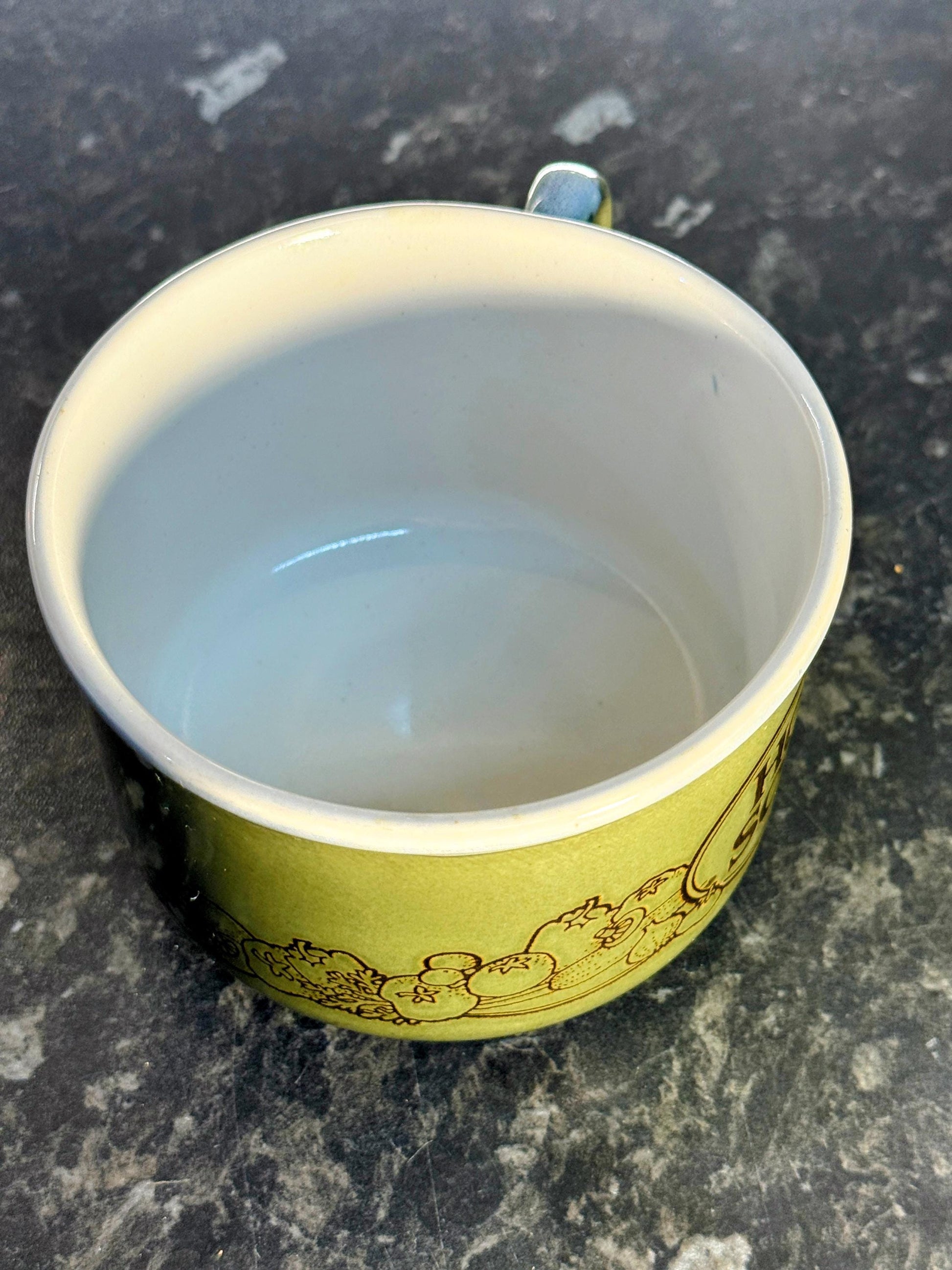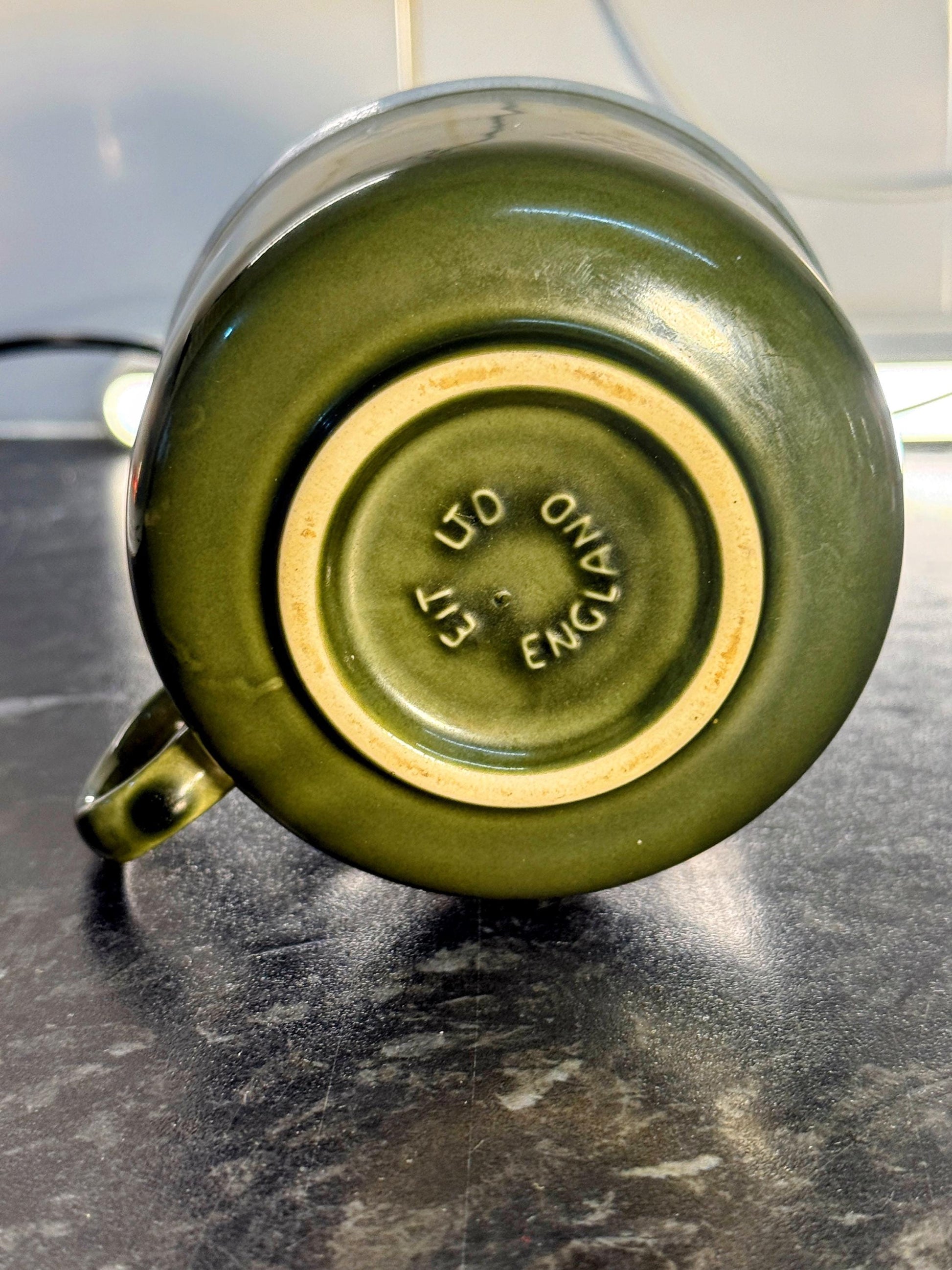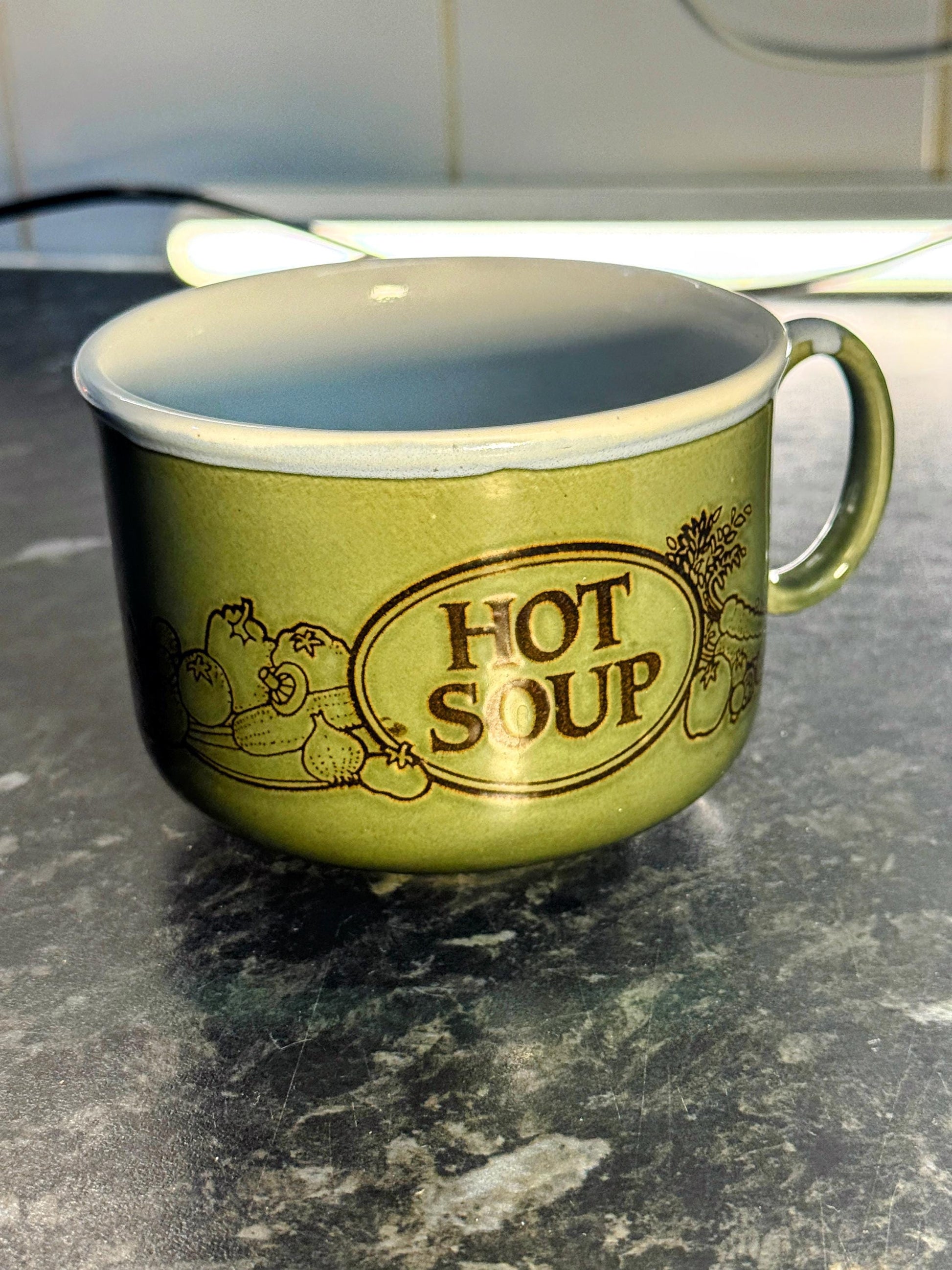 This vintage green stoneware soup mug features a classic “Hot Soup” design with illustrated vegetables and a traditional farmhouse style. Made in England, the mug has a chunky, well-balanced shape with a sturdy handle, making it ideal for soup, broth, or hearty hot drinks. Finished in an earthy olive green glaze with a cream interior, it has timeless rustic appeal suited to cosy kitchens, cottage décor, or vintage display shelving.