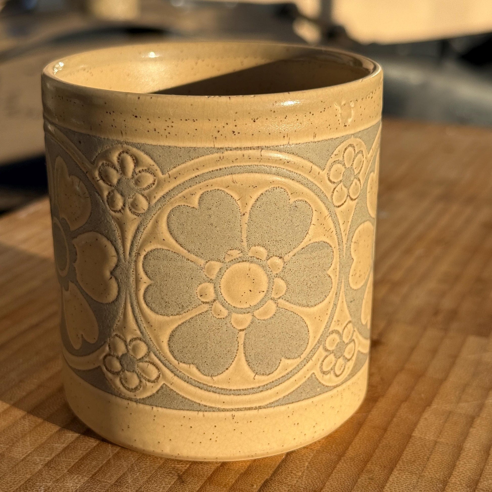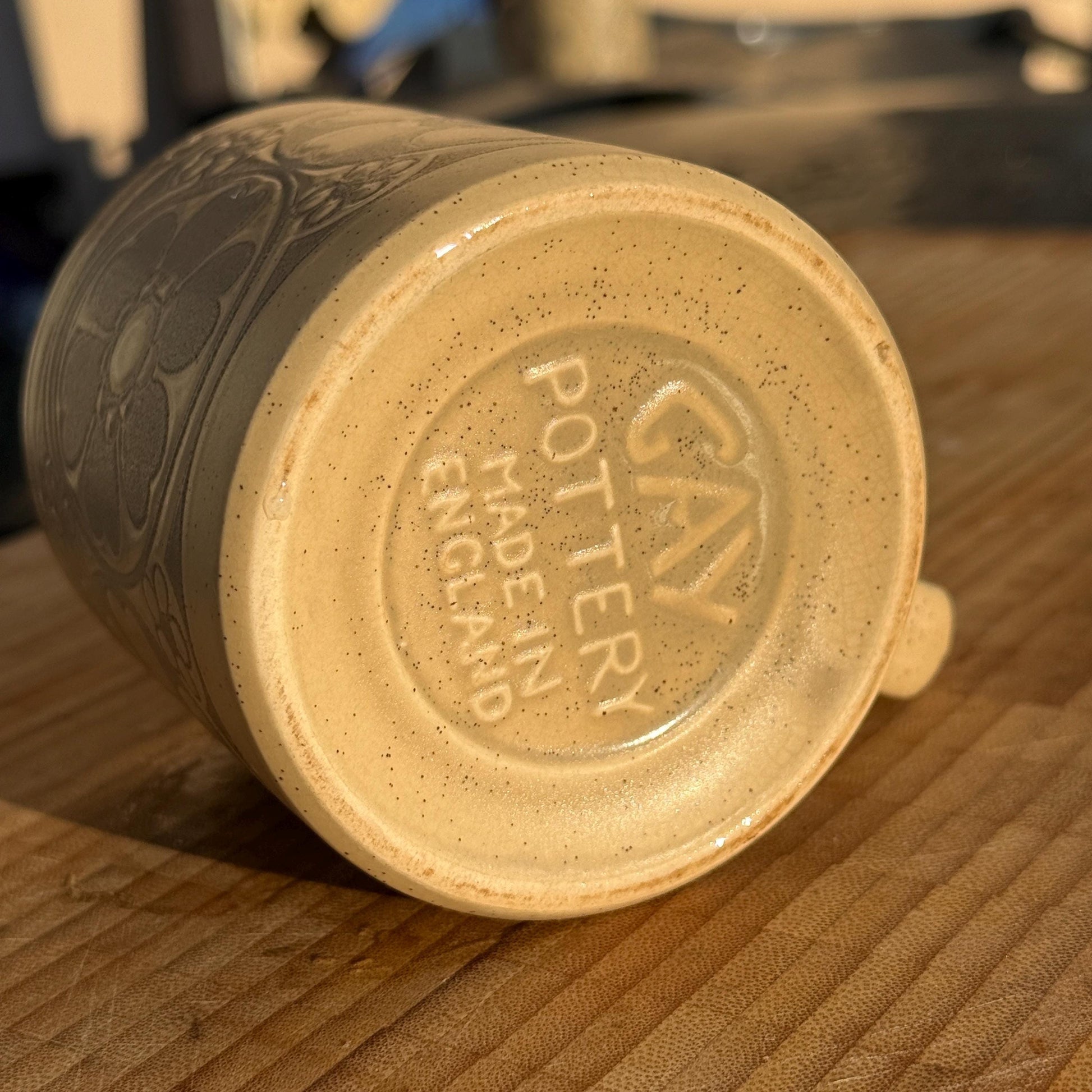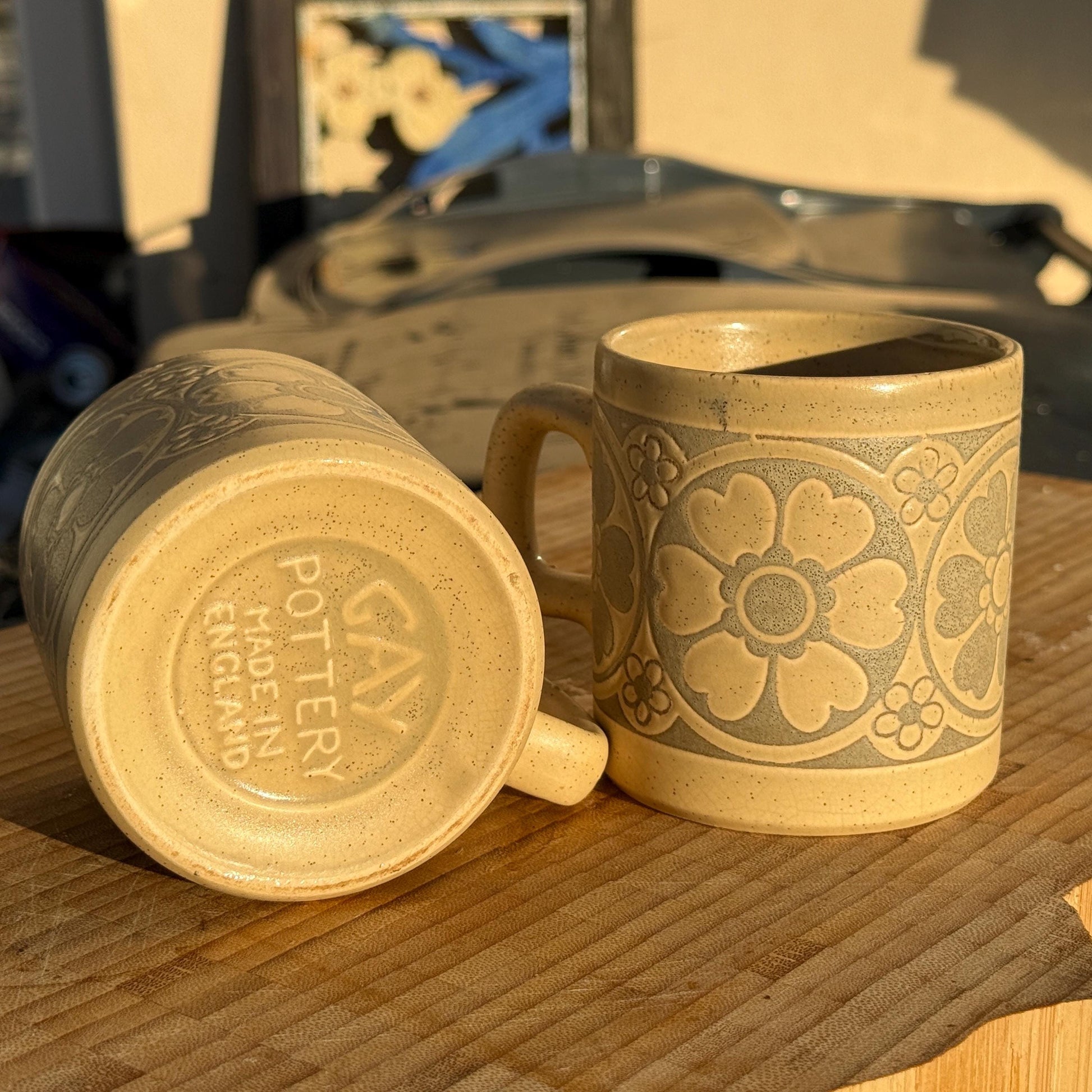 There’s something quietly comforting about the weight and texture of a vintage British studio pottery mug like this. Made by Gay Pottery and marked GAY POTTERY ENGLAND on the base, this floral stoneware mug features a raised relief design in soft cream and muted grey tones, finished with an earthy, speckled glaze.