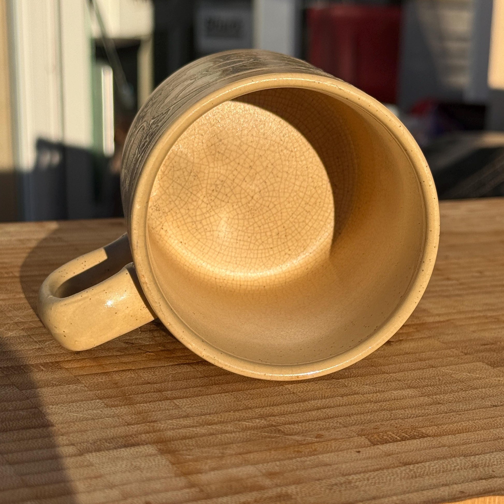 The tactile surface and natural glaze variations give the mug a handcrafted feel typical of studio pottery, making it well suited to both traditional and modern interiors. Age-related crazing is visible inside the mug and is shown clearly in the photographs. These characteristics are consistent with vintage studio ceramics and add to the piece’s authenticity and charm.